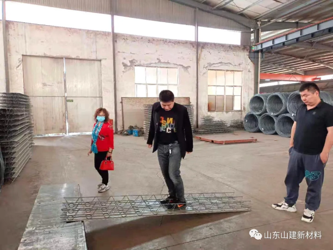 為了讓鞏總進一步了解我們產品焊接的牢固性,我隨即拿過一張成型的鋼筋桁架樓承板,并站在上面進行踩踏,以此來證明產品的可靠承重效果。
